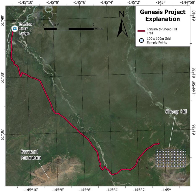 The Alaskan Gensis Project has ample surface showings of copper, nickel, platinum and palladium and has never been drilled. It is road accessible and less than 45 minutes, using this access trail (red line on the map), from one of Alaska’s most famous lodges, the Tonsina Lodge.