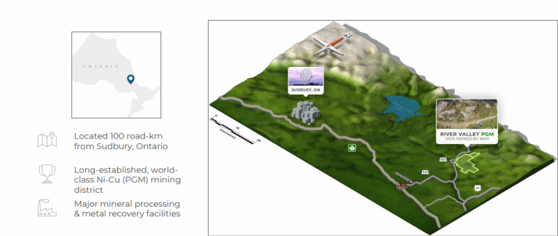 The PGE Division includes the 100% owned, multi-million-ounce, district-scale River Valley Project, one of North America’s largest undeveloped Platinum Group Element Projects, situated 100 km by road east of Sudbury, Ontario. In addition to River Valley, NAM owns 100% of the Genesis PGE-Cu-Ni Project in Alaska.