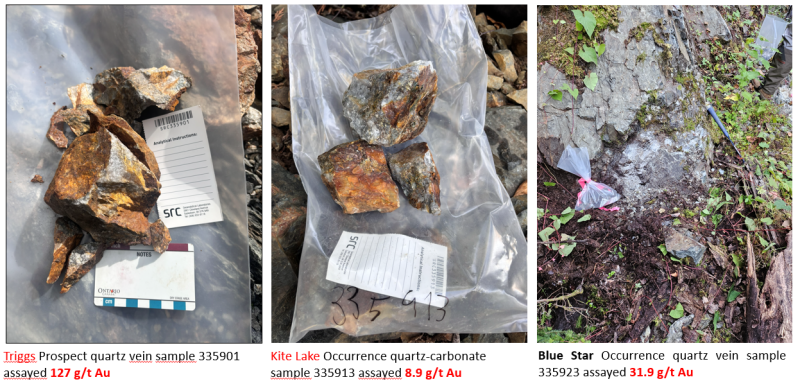 The mineral occurrences sampled and RUSH gold assay results are shown in Figure 1 and listed in Table 1. Photographs of selected high-grade samples are shown in Figure 2. The due diligence program successfully confirmed the presence of high-grade gold mineralization on the Project, particularly at the Triggs, Kite Lake, Stella and Blue Star Prospects.