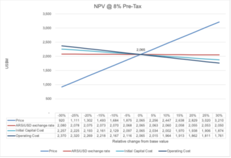 Pre-tax net present value (NPV) at an 8% discount of $2.065 billion for a single 20,000 tpa operation. Post-tax NPV at an 8% discount of $1.276 billion for a single 20,000 tpa operation.