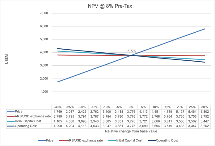 Economics sensitivities for the Project are set out in the charts below, on a pre-tax basis at an 8% discount, with a key sensitivity being the lithium carbonate prices, with not as much sensitivity seen in the change in CAPEX, OPEX and FX for the Project.