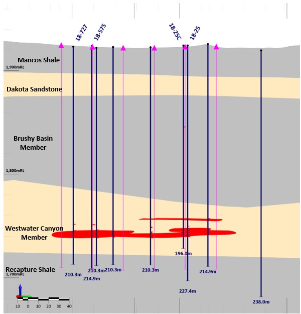 As a general illustration of the interpreted stratigraphy and uranium mineralization at Rio Puerco, Cross-section 18-005 is presented below in Figure 2. The following is a selection of interpreted uranium mineralization intersections for historical drill holes in Cross-section 18-005: