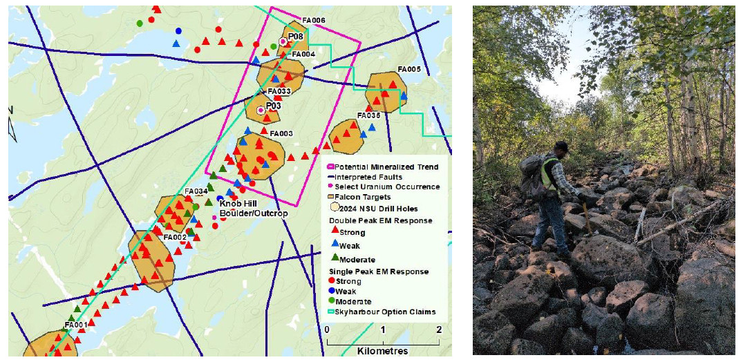 At target FA005, the conductor is intersected by an interpreted fault. Southwest of this, in an interpreted down-ice direction from the target, the prospecting team identified radioactive boulders within a boulder field. Metasedimentary and granitic boulders had radioactivity readings from 500-3,000 cps (Figure 2). At target FA033, where hole P03 was drilled by North Shore in 2024, a pegmatite boulder that was discovered registered 5,000-6,000 cps.