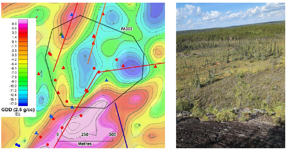 Target FA003 is at the south end of the potential mineralized trend defined by P03 and P08. At FA003, the EM conductor system and an associated magnetic low are disrupted and the system splits, with one arm going to the northeast, the other to the north. In addition, there is a gravity low anomaly which can be an expression of alteration that could be associated with uranium mineralization (Figure 3). The prospecting crew determined that most of the traces of the interpreted EM conductors are covered by muskeg. At the south end of the target zone, weakly radioactive pegmatitic and granitic boulders are present and are associated with an airborne radiometric uranium anomaly.