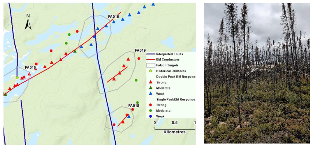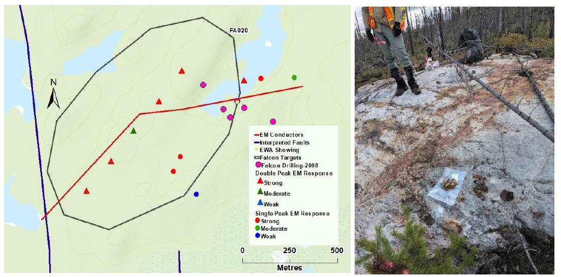 Target FA019, which is located at the eastern edge of the Property, is a 700 m long, strong EM conductor that is parallel to, and one km south of the main EM conductor trend at Falcon (Figures 1 and 5). The conductor is terminated at its western end by an interpreted prominent north-south-trending fault zone. The prospecting crew found one radioactive boulder that registered close to 7,000 cps on the scintillometer at this location. The granitic gneiss boulder had a 10 cm wide quartz vein with a mica-rich contact that displayed hematite alteration. The interpreted trace of the conductor roughly corresponds with an east-west-trending boulder train within a stream drainage.