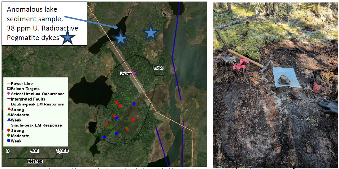 Approximately two km south of FA003 target FA002 is defined by two strong parallel EM conductors and a parallel magnetic low trend, and it is intersected by an interpreted northwest-trending fault. The conductor/fault intersections are under a lake, but a hill just southeast of the target showed a strong uranium anomaly defined by the 2022 airborne radiometric survey. The crew found several mica-rich stringers of radioactive pegmatite in outcrop in this area.