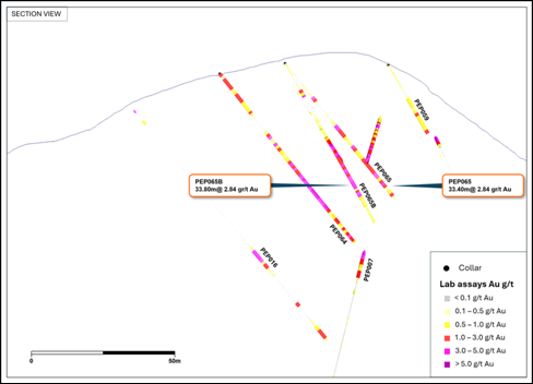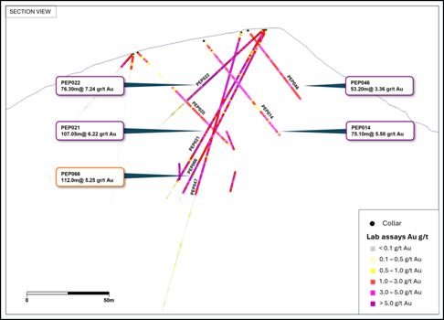PEP066 (met hole) – 112m @ 5.25g/t Au from surface