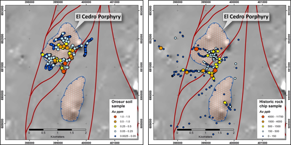 Company geological teams have examined these new geochemical data, in conjunction with historical mapping information and airborne geophysical data collected in 2012. An outcome of this work is the hypothesis that El Cedro may in fact consist of multiple porphyry intrusions, with a second potential intrusive system being identified to the south of the known El Cedro porphyry, within the same regional structural corridor.