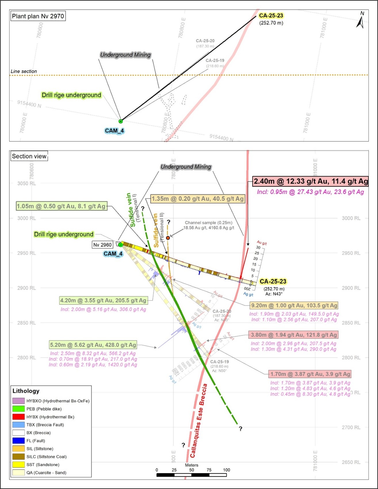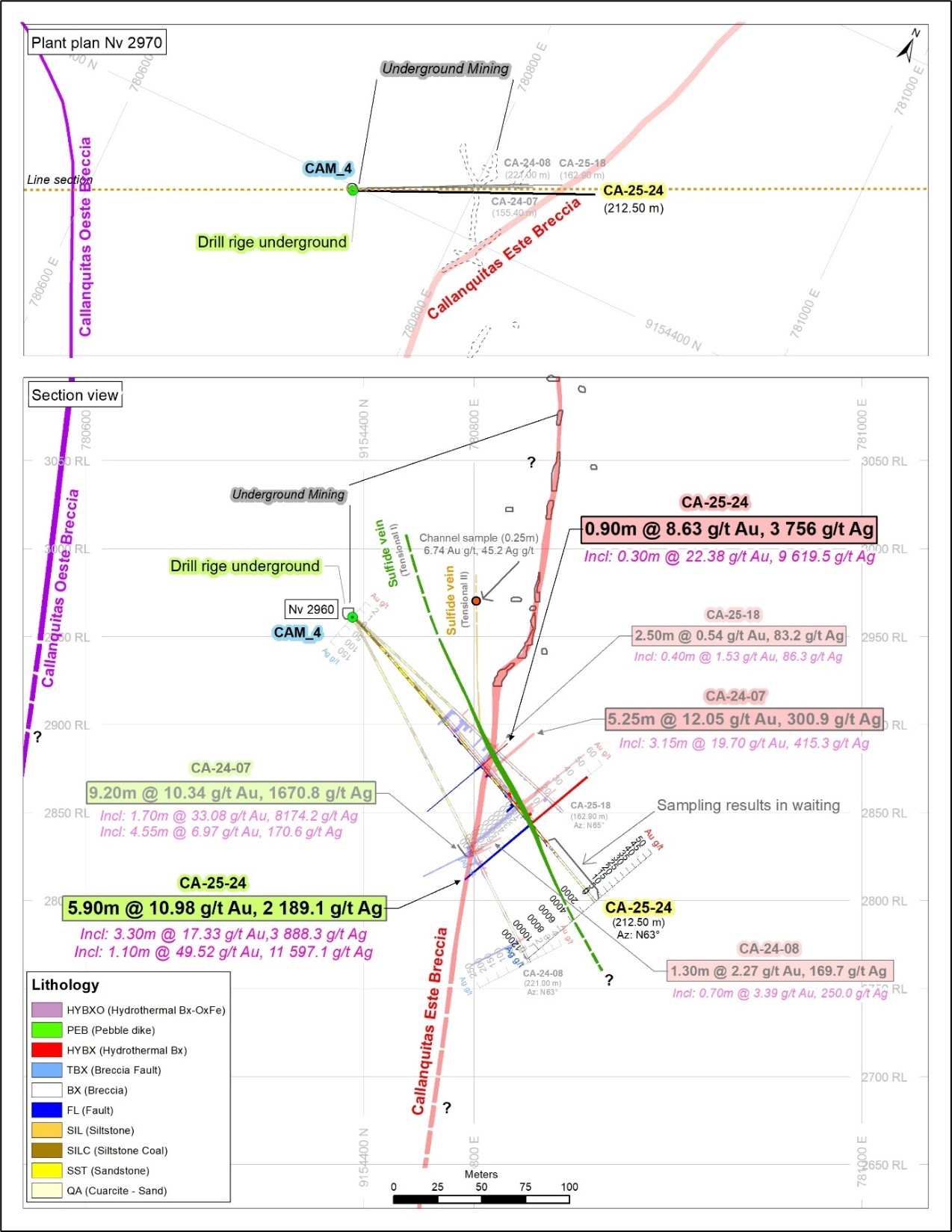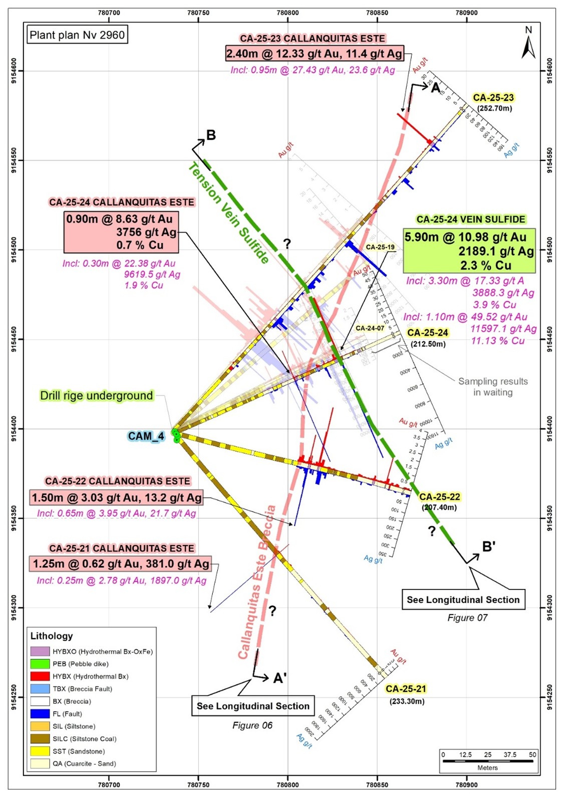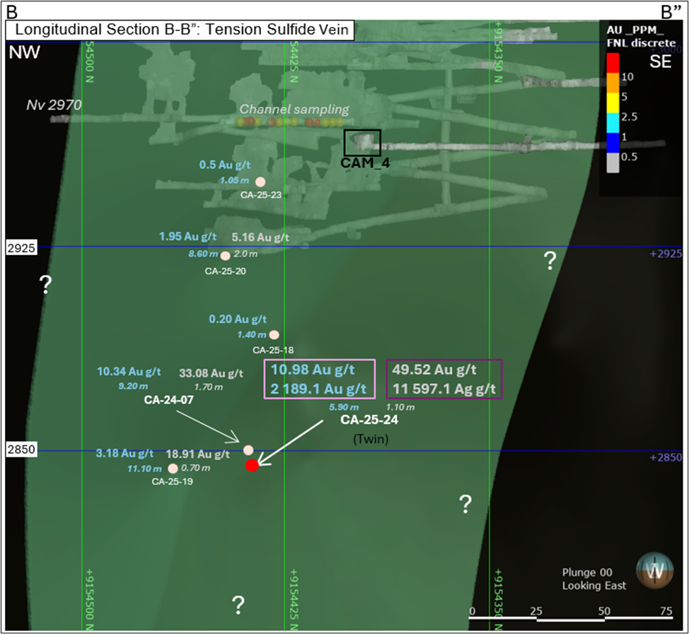 The drillhole CA-25-24 intercepted the Callanquitas Este structure and Tension Vein sulfide zone, located 6 meters south of CA-24-07 (DDH historic 07), a twinned hole. The drillhole CA-25-23 intercepted the Callanquitas Este structure and Tension Vein sulfide, located 150 meters north of 07. The drillhole CA-25-22 intercepted the Callanquitas Este structure, located 55 meters south of 07. The drillhole CA-25-21 intercepted the Callanquitas Este structure, located 103 meters south of 07. All boreholes are drilled from chamber 04, located at an elevation of 2960 meters above sea level. (See Figure 1 and 2-5, Section: drill holes and Longitudinal section).