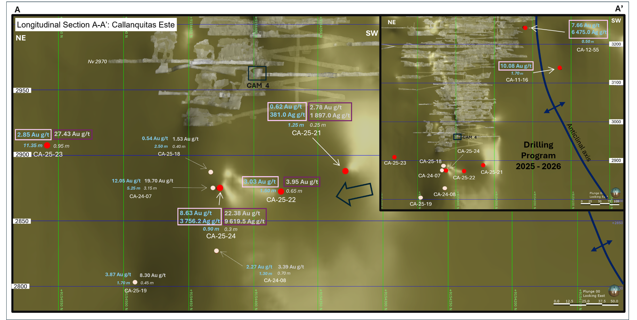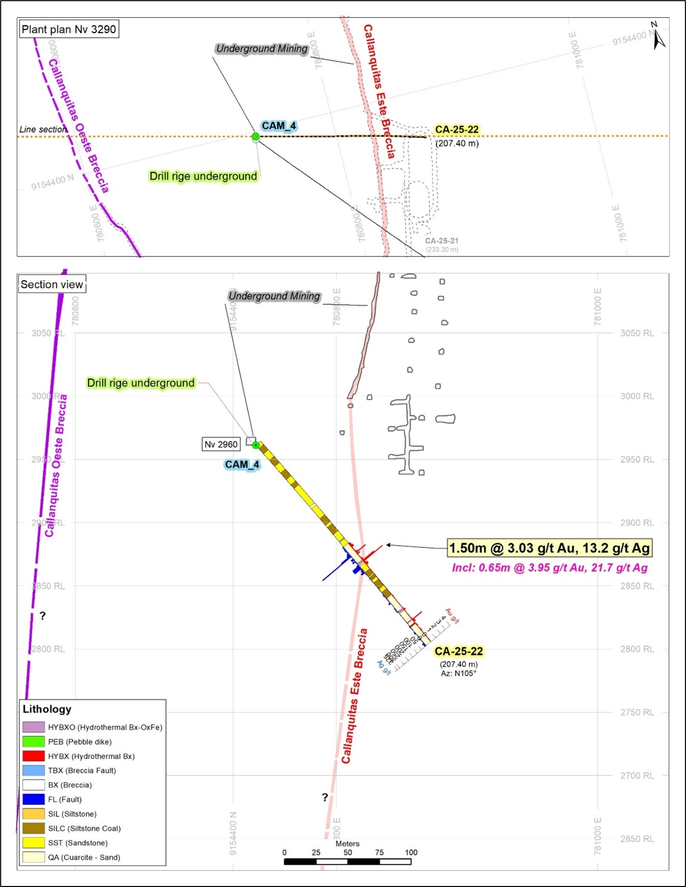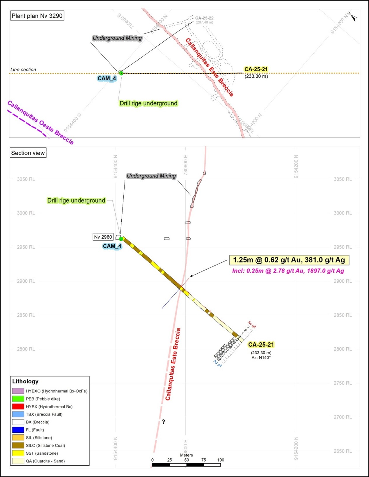 The drillhole CA-25-24 intercepted the Callanquitas Este structure and Tension Vein sulfide zone, located 6 meters south of CA-24-07 (DDH historic 07), a twinned hole. The drillhole CA-25-23 intercepted the Callanquitas Este structure and Tension Vein sulfide, located 150 meters north of 07. The drillhole CA-25-22 intercepted the Callanquitas Este structure, located 55 meters south of 07. The drillhole CA-25-21 intercepted the Callanquitas Este structure, located 103 meters south of 07. All boreholes are drilled from chamber 04, located at an elevation of 2960 meters above sea level. (See Figure 1 and 2-5, Section: drill holes and Longitudinal section).