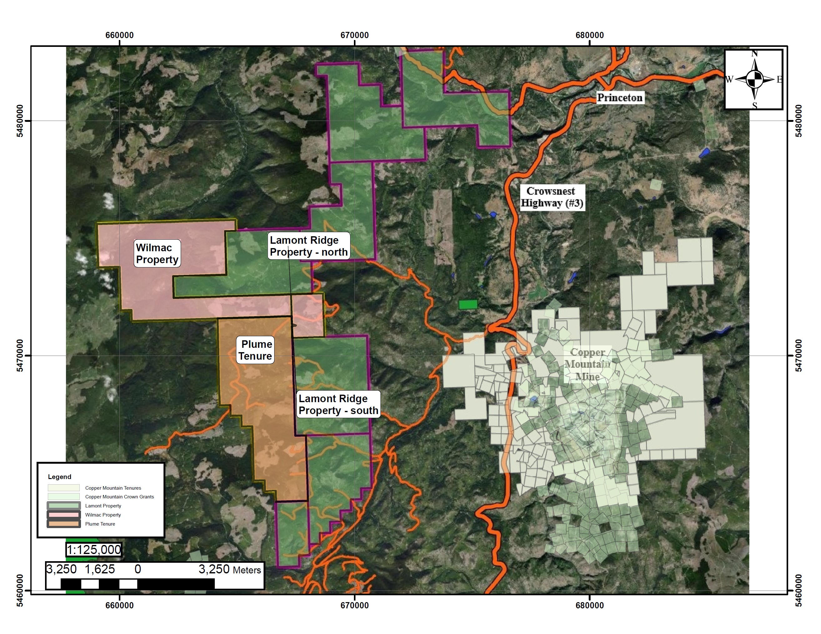 Lamont Ridge: seven claims totaling 7,086 ha, adjoining Wilmac to the north and south and located ~10 km west of Hudbay Minerals Inc.’s Copper Mountain Mine. Historical and 2024 infill soils outline extensive copper anomalies; a 3D Induced Polarization (IP) / Audio-frequency Magnetotellurics (AMT) survey delineates two interpreted parent intrusions with pipe-like features to surface.