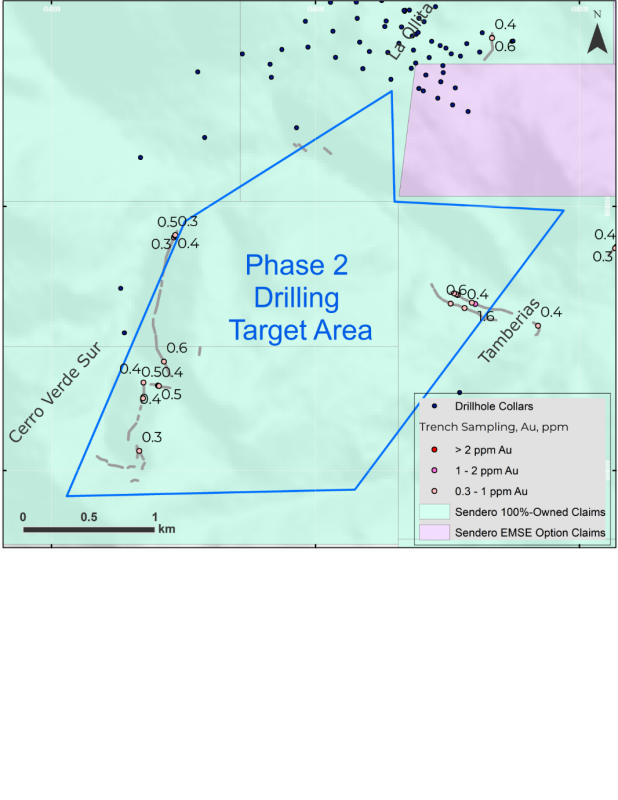 Sendero successfully executed Phase I of its exploration program, which comprised 3,126 meters of core drilling in eight holes, 715 line kilometers of airborne magnetics and radiometrics, 10 square kilometers of IP lines, and 211 line kilometers of ground magnetics surveys. This work generated results which significantly raised the accuracy of structural interpretation and decidedly demonstrated presence of both porphyry and epithermal mineralization on the property, as is common at other deposits in the Vicuña Belt.