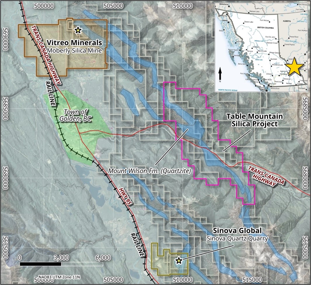 The Table Mountain Silica Project is located approximately 4 kilometres east of Golden, B.C., Canada, with excellent year-round road access and proximity to the Canadian Pacific Railway’s Golden rail yard. The property covers roughly 2,526 hectares, encompassing up to 11 kilometres of regionally mapped strike length of the Mount Wilson Formation quartzite, with widths ranging from 300 to 1,400 metres at surface. Table Mountain is strategically situated near two established high-purity silica operations – the Moberly Silica Mine and the Sinova Quartz Quarry – both of which demonstrate silica purity greater than 99.6% SiO₂.(1)(2)* This advantageous location highlights the project’s potential to become a significant source of high-purity silica in a region known for hosting premium-quality silica deposits.