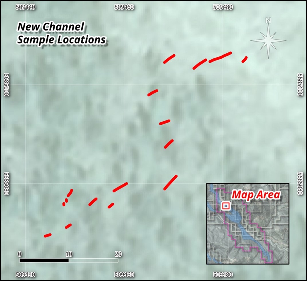 A total of 47 samples were collected, primarily along two main channel lines at 1-metre intervals (truncated at outcrop edges) covering an area of approximately 2,500 square metres. Channels were oriented perpendicular to bedding to approximate true widths of the silica zones. Sampling locations were positioned to complement the 2024 and 2025 UAV LiDAR surveys and to guide upcoming resource definition and drilling planned for the 2026 field season. Figure 2 below illustrates the sample locations within the mapped quartzite unit.