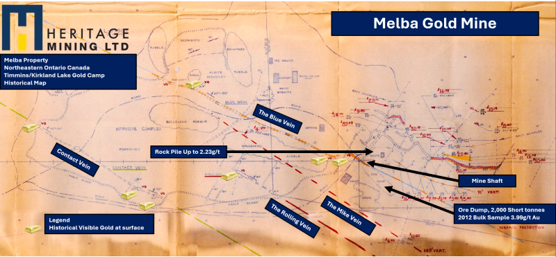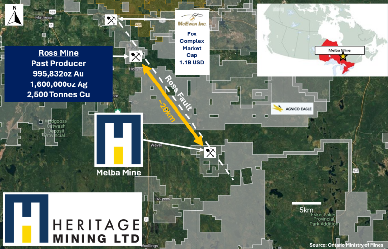 VANCOUVER, BC, October 15, 2025 – TheNewswire – Heritage Mining Ltd. (CSE: HML FRA: Y66) (“Heritage” or the “Company”) is pleased to provide historical highlights supporting a Phase 1 Exploration plan further to the press release dated September 23, 2025, the closing of the Melba Property Acquisition in Northeastern Ontario Canada within the Timmins/Kirkland Lake Gold Camp (Figure 10). The Melba Mine is located 22km southeast from the Ross Mine along the Ross Fault (Figure 10). The Company anticipates to mobilize this program in short order.