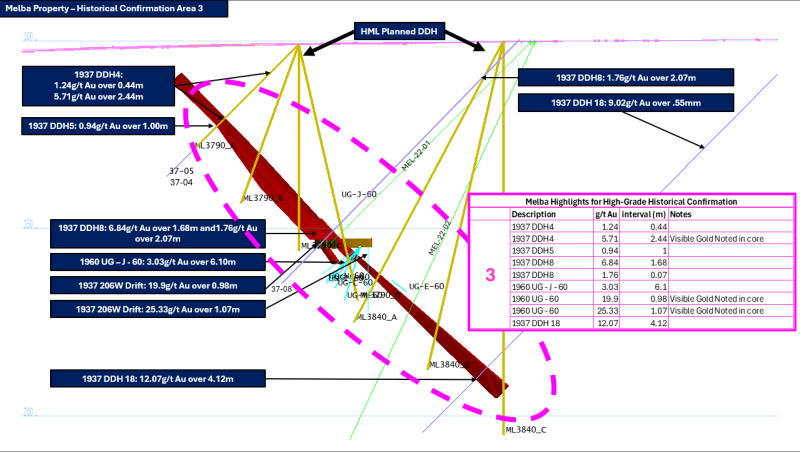 Figure 3: Melba Historical Highlight Compilation from Assessment reports and Historic Maps, Historic calculations have been re-calculated to g/t Au from 35$ gold, the Company used Troy Ounce