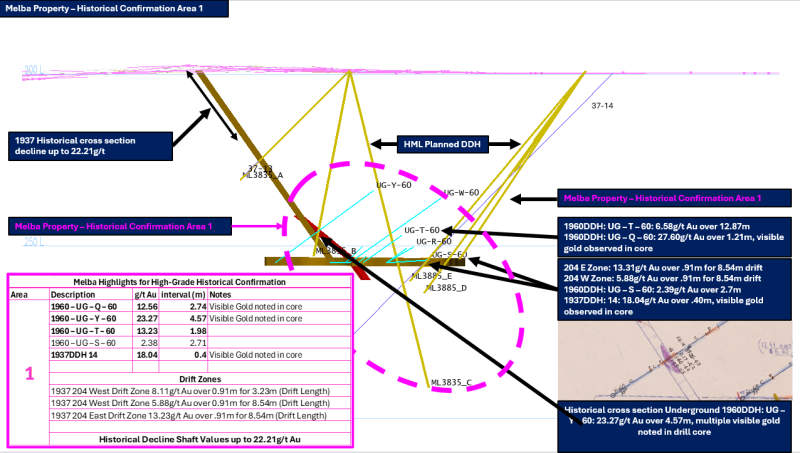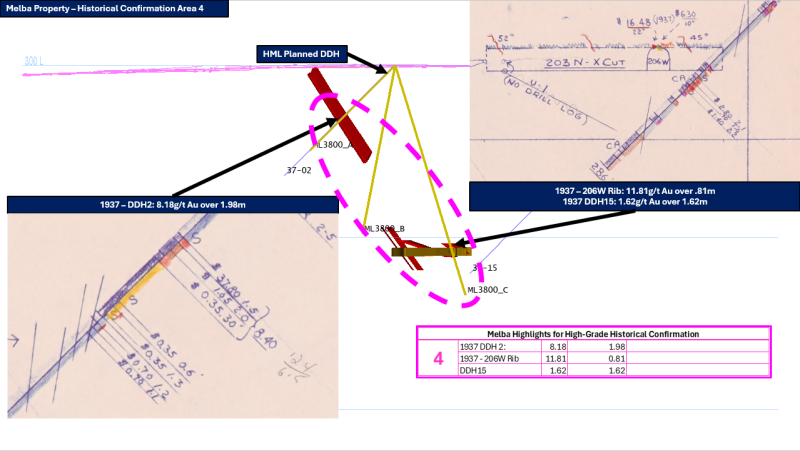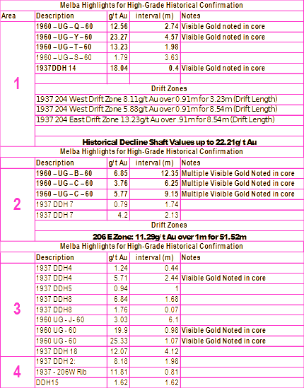 Figure 2: Melba Historical Highlight Compilation from Assessment reports and Historic Maps, Historic calculations have been re-calculated to g/t Au from 35$ gold, the Company used Troy Ounce