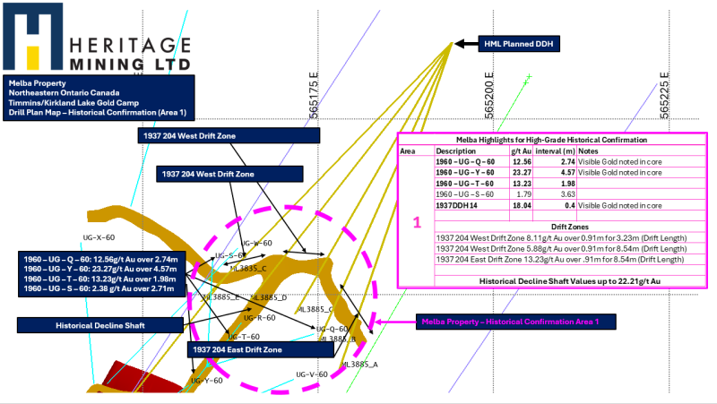 Visible Gold Shines in Heritage Mining’s Historic Drilling – Up to 23.27 g/t Au Over 4.5m and 6.85 g/t Au Over 12.35m near Surface at the Melba Project