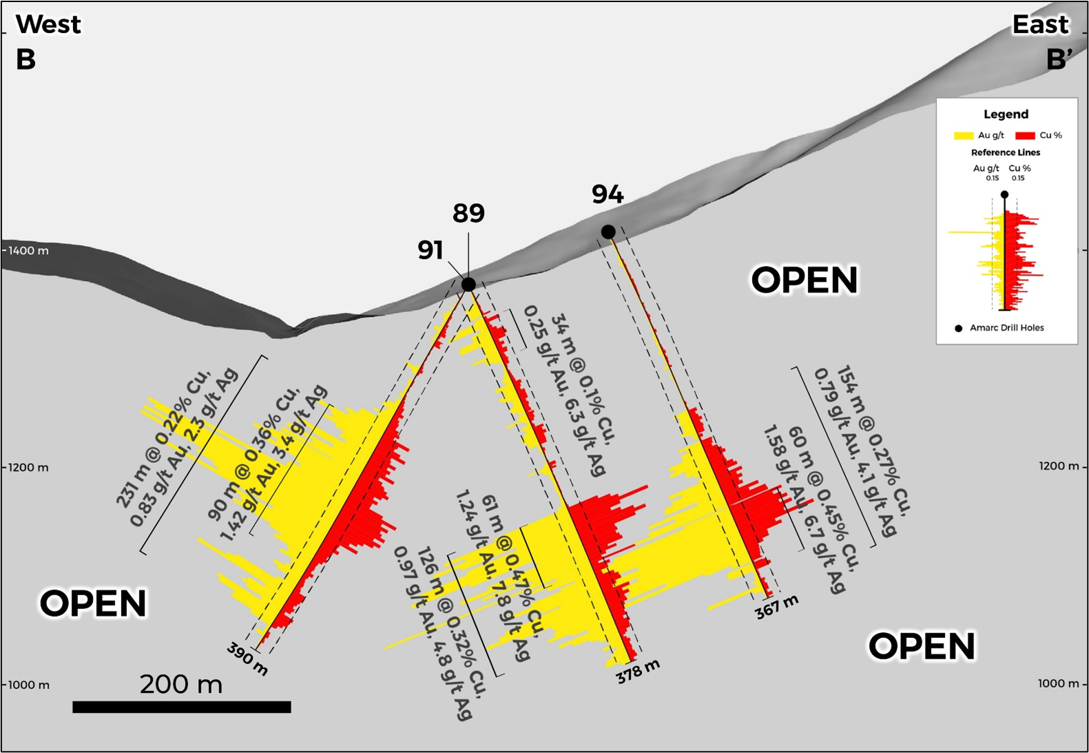 Twenty-four drill holes (9,687 m) were completed at the AuRORA Deposit in 2025: 23 of these are expansion step-out holes drilled over an area of 1 km by 1 km (see Amarc release October 22, 2025). Assay results from six drill holes completed on Sections 8000N and 8100N announced today have successfully expanded AuRORA +200 m to the north (see Figures 1 to 3, and Tables 1 and 2). The deposit remains open to further expansion to the north, east and west of Section 8000N and 8100N, with assay data pending from additional 2025 drill holes located further to the north. This northern extension to the deposit is in addition to partial assay results from AuRORA hole JP25098 announced in September that expand the deposit approximately 300 m to the southeast. Host rocks, alteration and mineralization remain consistent with that encountered in the 2024 AuRORA discovery drill holes.