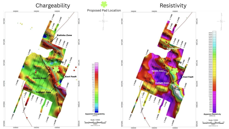 The main target of this exploration program will be the Gap Zone; this linear anomaly is situated along the East Fault between the Howie and Twilight Zones. The gap zone is host to strong coinciding chargeability and resistivity anomalies. This area has not seen any historical drilling. A proposed shallow fence will be executed over the target. The drill rig will be rotated or re-located, with two scissored holes to follow, targeting the plunge of the Twilight Zone. Final pad locations will be determined based on an upcoming site visit.