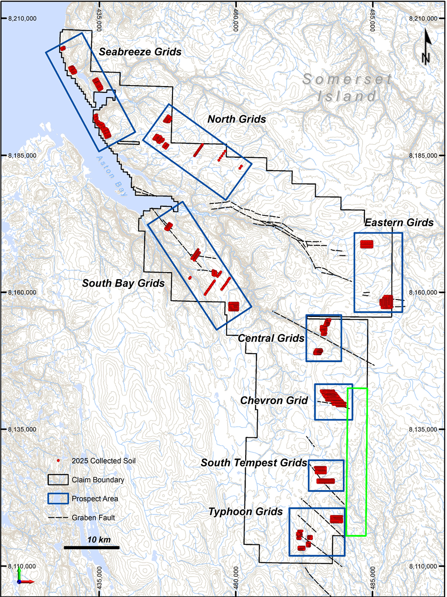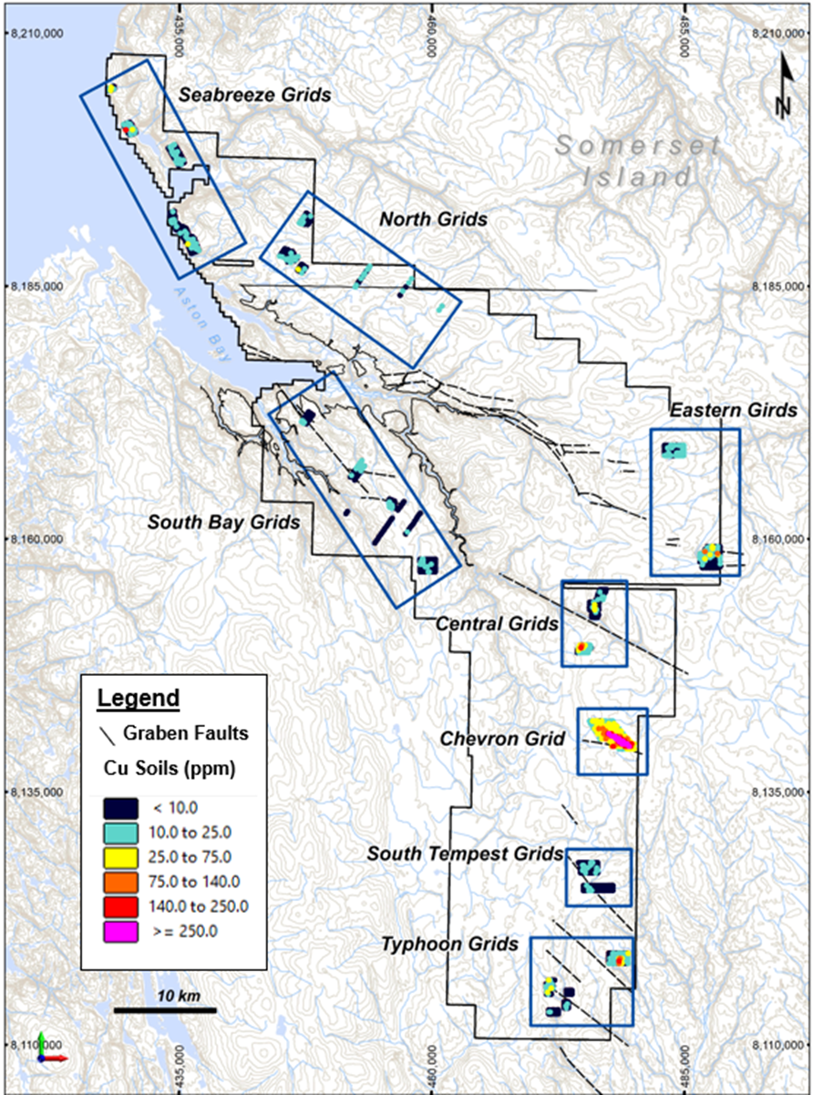 “We are very excited by this discovery of a new Storm-sized copper anomaly at our Project on Somerset Island. At the main Storm area, a similar copper-in-soil anomaly sits above a significant near-surface copper resource, as well as above several other deeper copper discoveries. The newly identified Chevron area shows similar potential. This four-kilometre trend has seen no significant surface sampling to date, and no geophysics or drilling has ever been conducted. The follow-up exploration will add significant discovery potential to next season’s program, in addition to the compelling targets already defined by this year’s helicopter-borne Mobile Magnetotelluric geophysical survey.