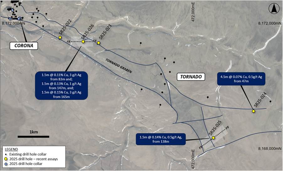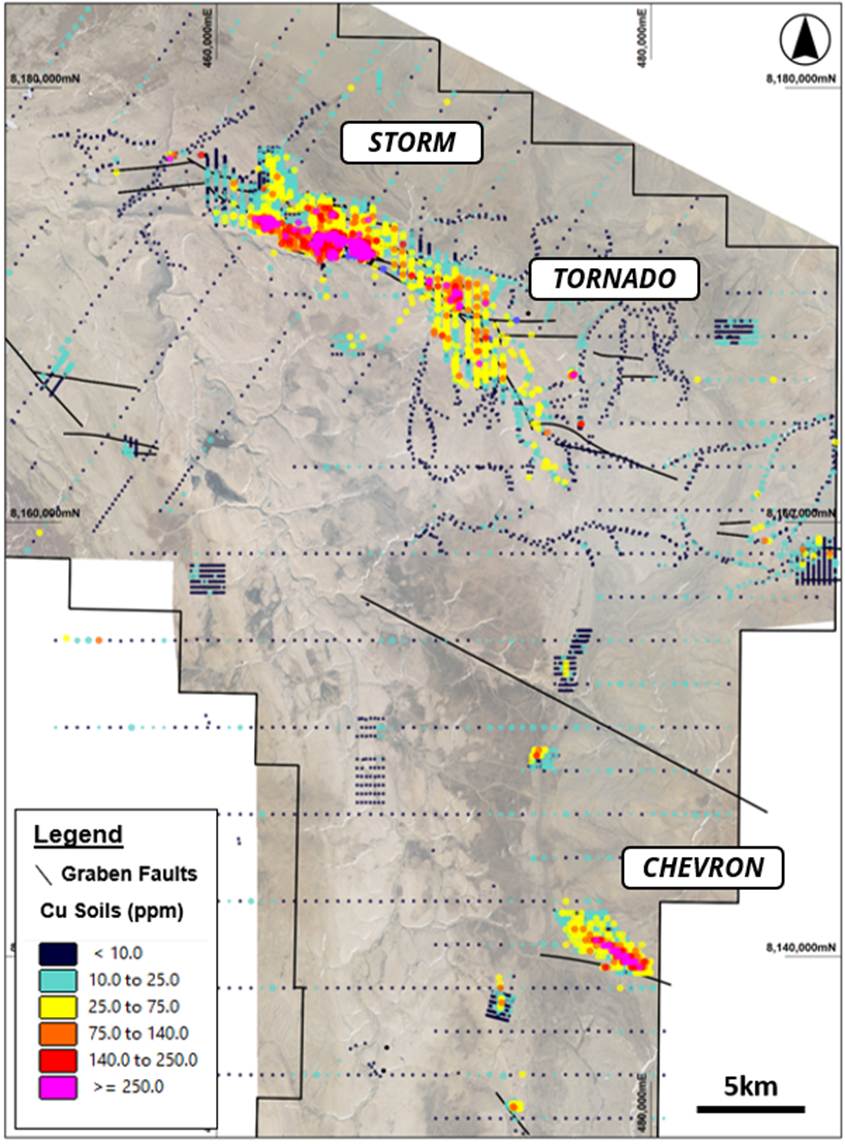 The Tornado Graben is interpreted to be a direct analogue to the Central Graben at Storm, which hosts the known copper deposits at the project. Its location, approximately 5km along strike from Storm, large copper in soil anomalies, and identical structural features rank the area highly and are a likely continuation of Storm. Exploration at Tornado during 2025 consisted of five reverse circulation drill holes with the aim of testing below known fault-hosted, surficial copper occurrences and delineating the stratigraphy of the area.