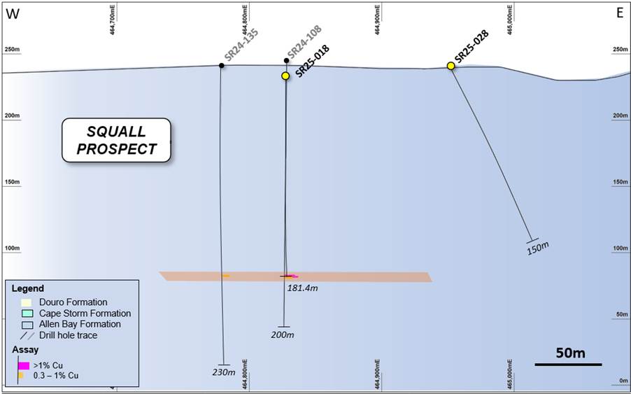 Drill hole SR24-135 is located approximately 60m to the west of Squall and also intersected copper mineralization within the same stratigraphic horizon (1.5m @ 0.5% Cu, 3.0g/t Ag from 163.07m downhole).