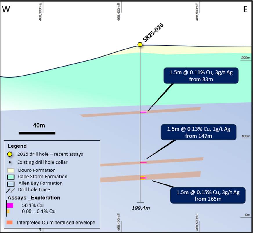 Three distinct, copper-silver mineralized horizons were intersected within SR25-026, including 1.5m @ 0.11% Cu, 3.0g/t Ag from 83.8m, 1.5m @ 0.13% Cu, 1.0g/t Ag from 147.8m, and 1.5m @ 0.13% Cu, 3.0g/t Ag from 167.6m downhole. All copper sulphides were hosted within the Allen Bay Formation and are interpreted to be stratabound. However, it is inconclusive whether the intersections in SR25-026 are related to the MMT anomaly.
