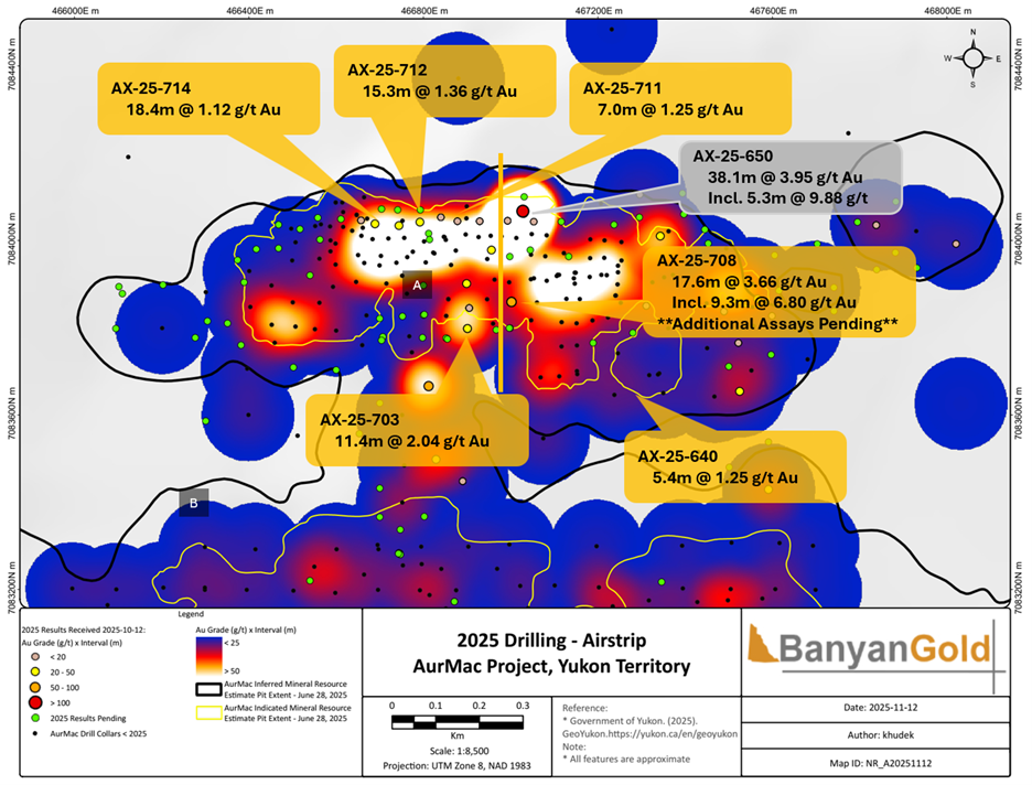 VANCOUVER, BC / ACCESS Newswire / November 13, 2025 / Banyan Gold Corp . (the “ Company ” or “ Banyan “) ( TSX-V:BYN )( OTCQB:BYAGF ) continues to intersect high-grade mineralization in Airstrip (“ Airstrip “) and extend the high-grade domains at its AurMac Project (“ AurMac “).
