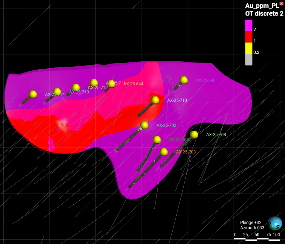AX-25-703 – 2.04 g/t Au over 11.4m, including 3.60 g/t Au over 5.6m with a high-grade interval of 7.98 g/t Au over 1.2m