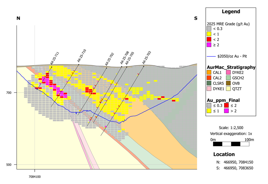 AX-25-708 – 3.66 g/t Au over 17.6 metres (“m”), including 6.80 g/t Au over 9.3m, with high-grade interval of 35.98 g/t Au over 1.6m