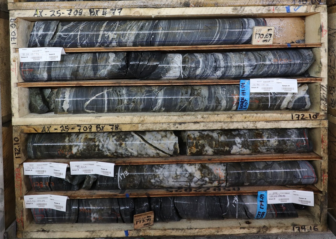 Figure 4: High-grade skarn mineralization in drill hole AX-25-708 associated with pyrrhotite and quartz replacement.