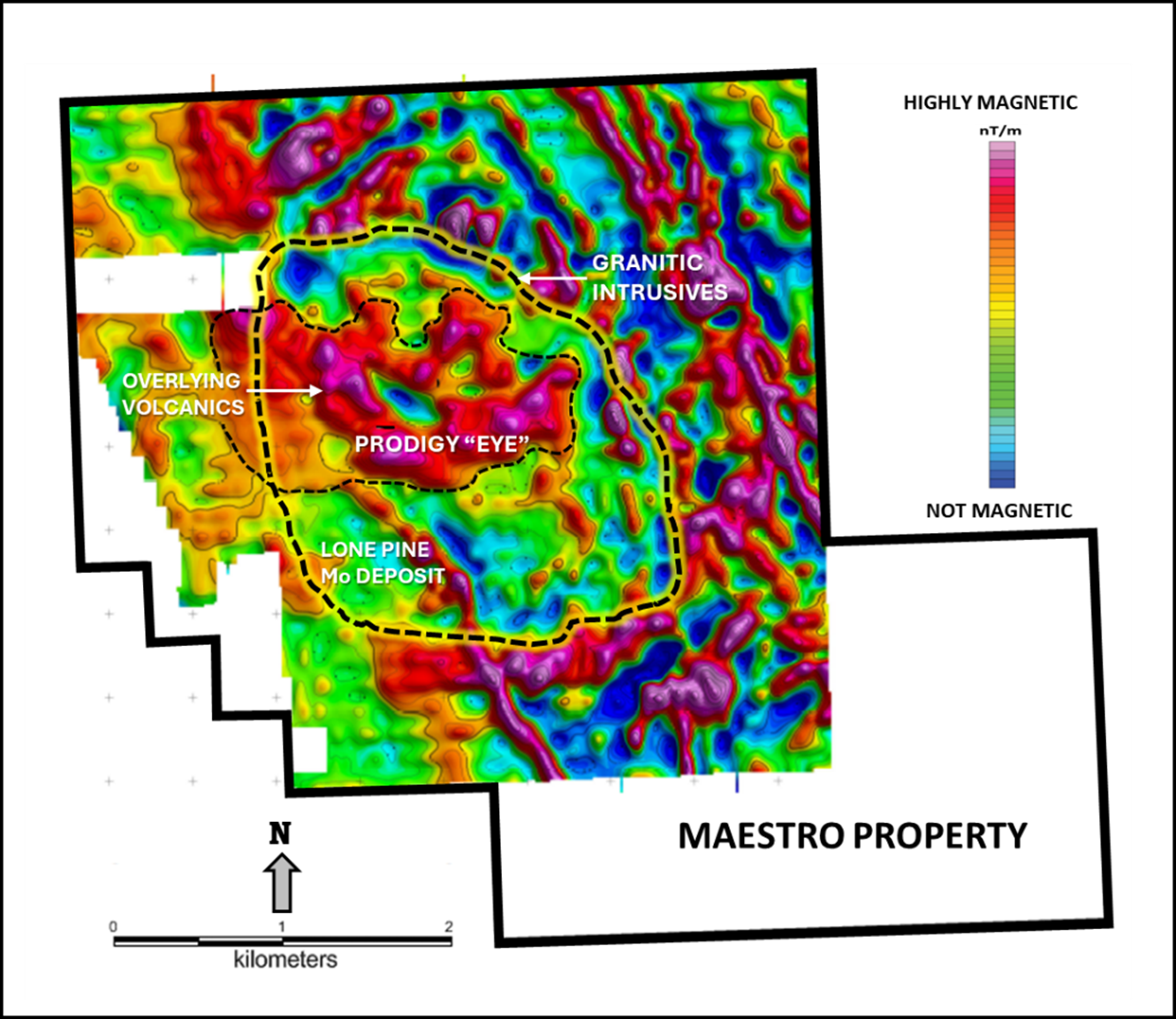 Diamond drill hole PR25-13, the last hole of Phase 3, was drilled to test the west side of a northwest trending magnetic low feature referred to as the Prodigy “EYE” created by pervasive hydrothermal rock alteration and mineralization (see Figure 1). It intersected broad intervals of Au-Ag-Mo-Cu mineralized quartz-ankerite veins and breccia bodies from shallow depths representing a high to intermediate sulfidation epithermal mineral system. Below this Epithermal Au-Ag-Mo-Cu system the hole cut a newly discovered Porphyry Au mineral system continuously over some 340 meters. Highlight intervals from hole PR25-13 included: