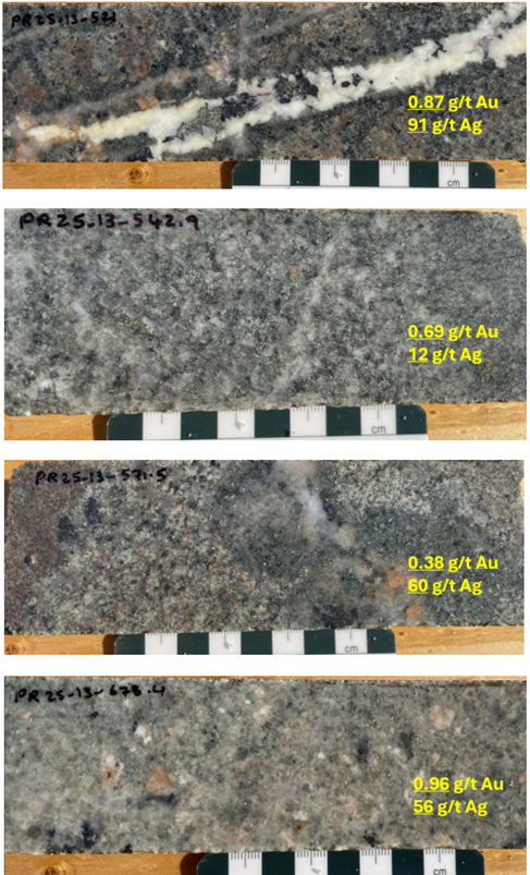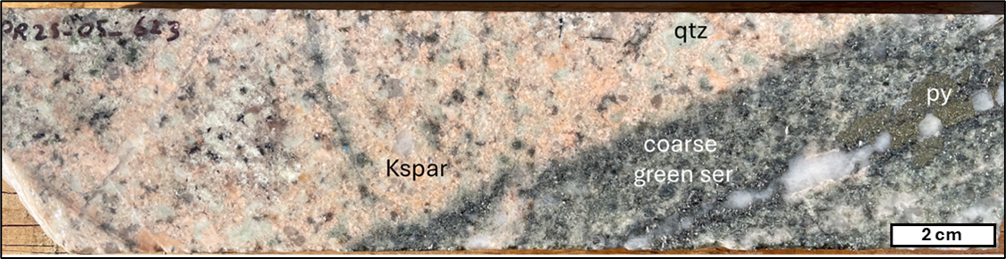 PR25-05 at 623 m – Quartz-monzonite with K-silicate alteration, overprinted by green sericite, and cut by quartz-pyrite veins. This sample represents gold-rich porphyry mineralization and grades 0.92 g/t Au and 6 g/t Ag (from a 2.8 m sample interval).