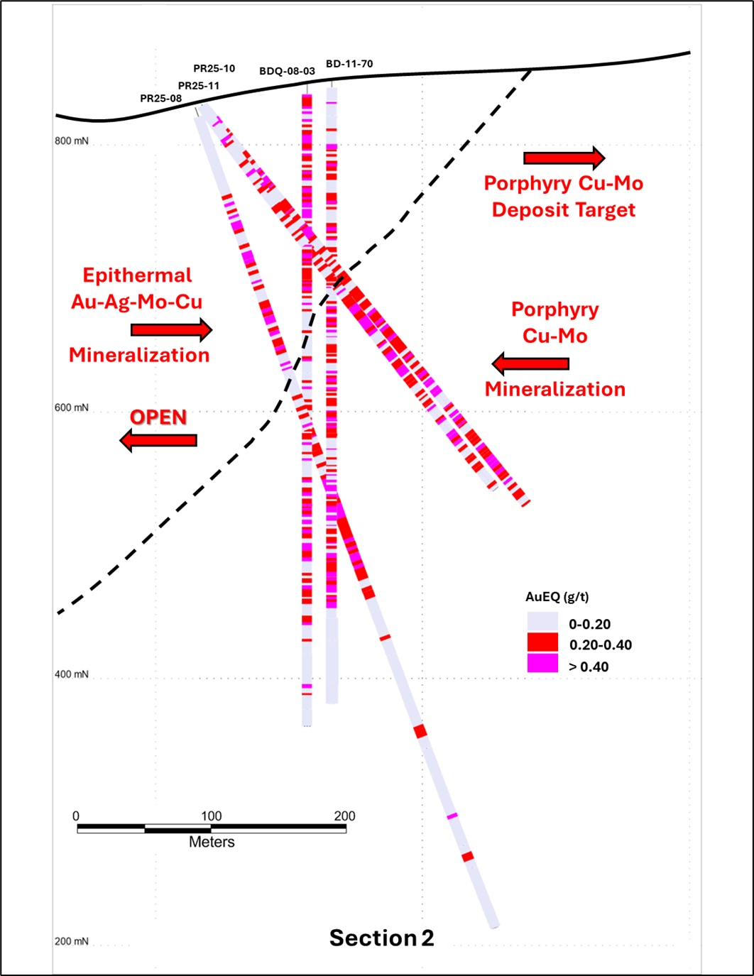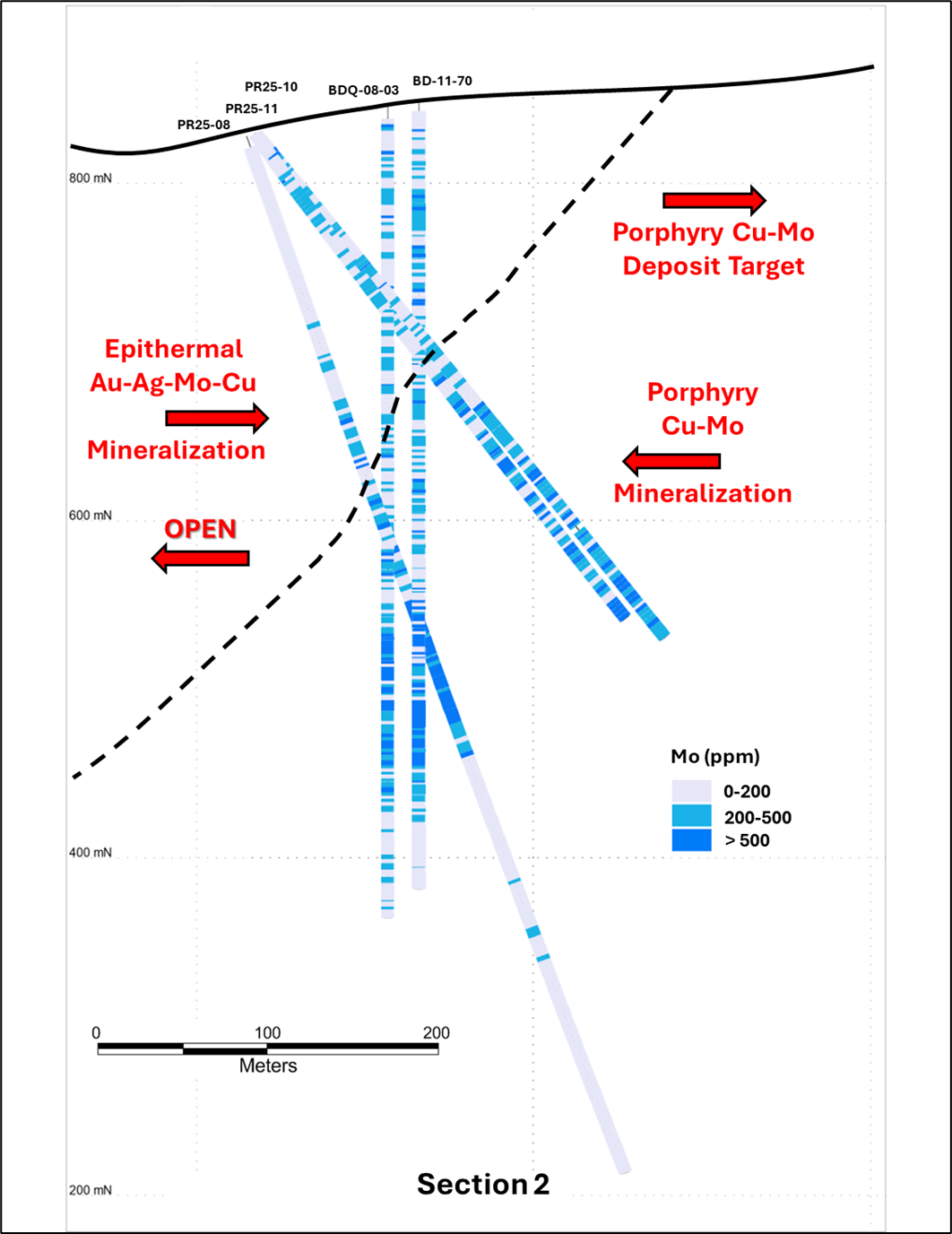 The quartz monzonite and the overlying volcanic rocks are affected by strong K-feldspar and biotite alteration, respectively. Both host rocks are cut by quartz Mo-Cu veins. This early porphyry-type Mo-Cu mineralization has been intersected in several drill holes located on the east and northeast of the “EYE”. Notably, drilling has identified increasing Cu grades to the northeast, indicating a potential Porphyry Cu-Mo deposit target located northeast of the Prodigy “EYE” (see Table 5 and Figures 2, 5 and 6). Hole BD-11-70 intersected 151 m grading 0.12% Cu and 0.04% Mo, hole BD-11-68 intersected 107 m grading 0.10% Cu and 0.08% Mo, hole PR25-10 intersected 92 m grading 0.11% Cu and 0.04% Mo, and hole PR25-11 intersected 90 m of 0.16% Cu and 0.04% Mo.