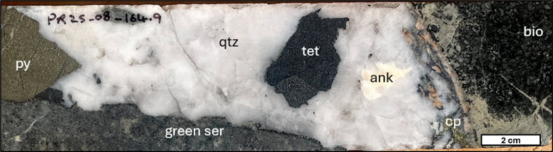 PR25-08 at 165 m – Andesite with green sericite alteration cut by high-sulfidation type quartz-ankerite veins with coarse tetrahedrite, pyrite, and chalcopyrite. This sample represents Epithermal Au-Ag mineralization, starting at shallow depths, and grades 0.29 g/t Au and 229 g/t Ag (from a 3 m sample interval).