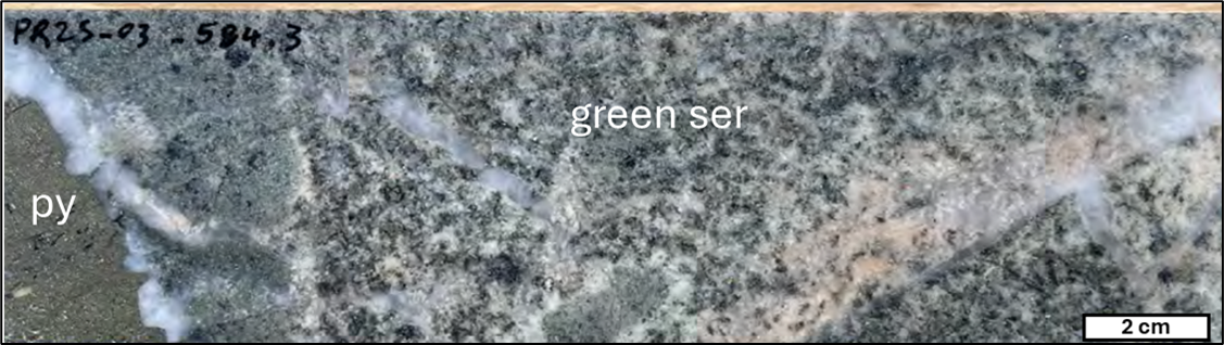 PR25-03 at 584 m – Quartz monzonite with remnants of pink K-feldspar overprinted by strong pervasivecoarse green sericite alteration with disseminated pyrite and trace tetrahedrite, cut by quartz-ankerite vein with massive coarse pyrite. This sample represents Porphyry Au mineralization and grades 0.64 g/t Au and 84 g/t Ag (from a 2 m sample interval).