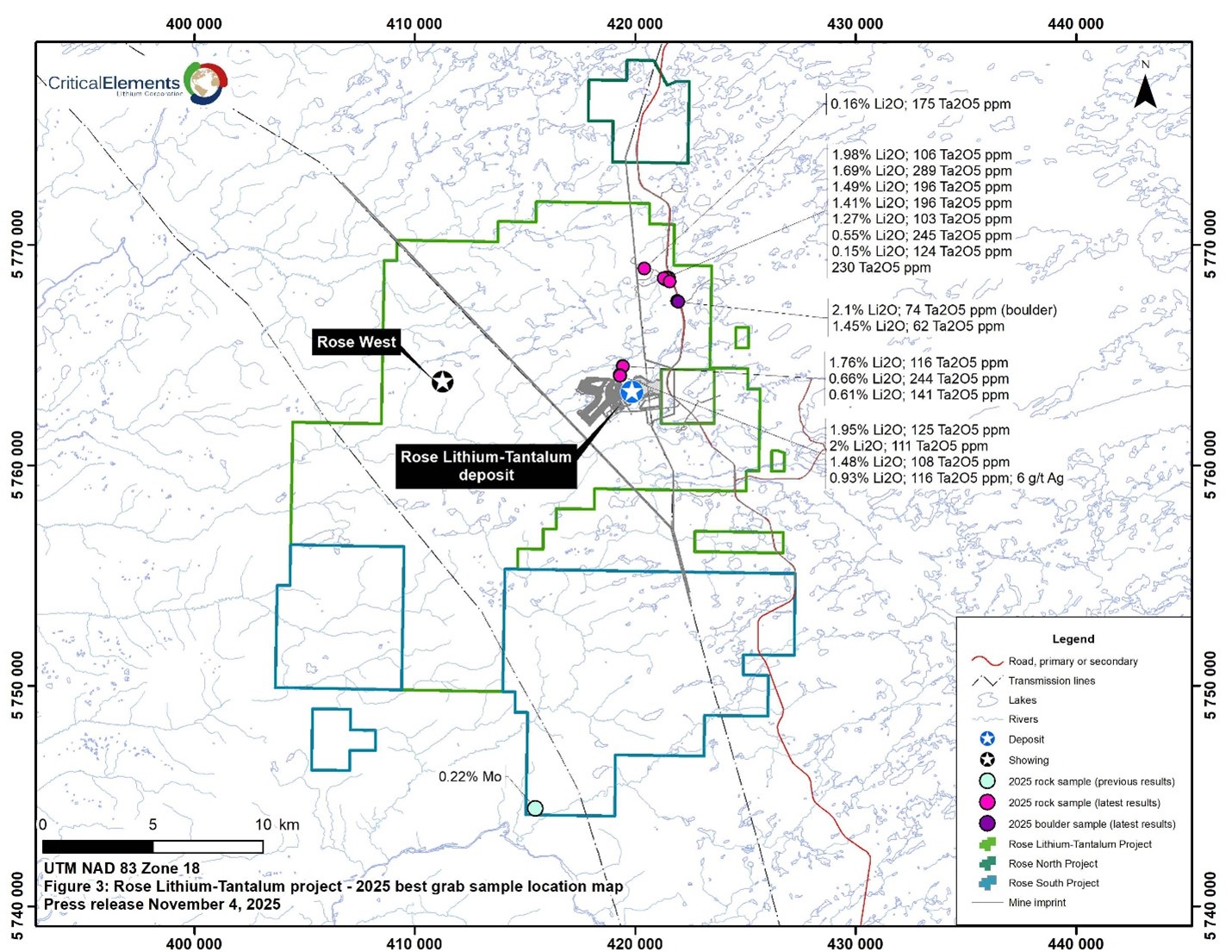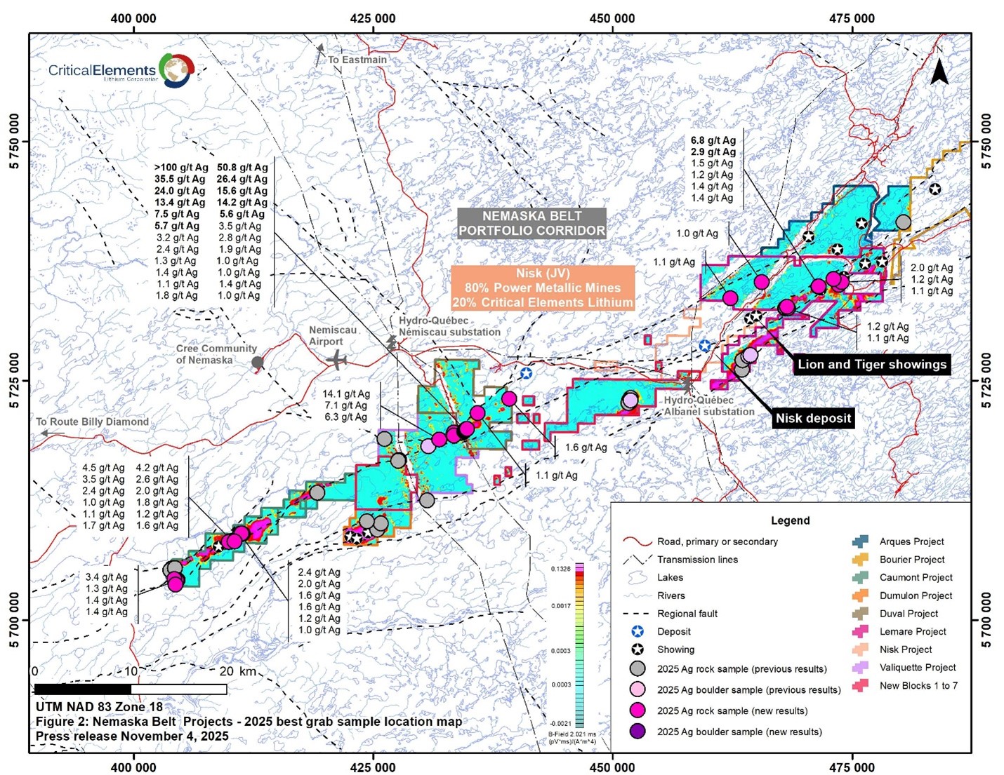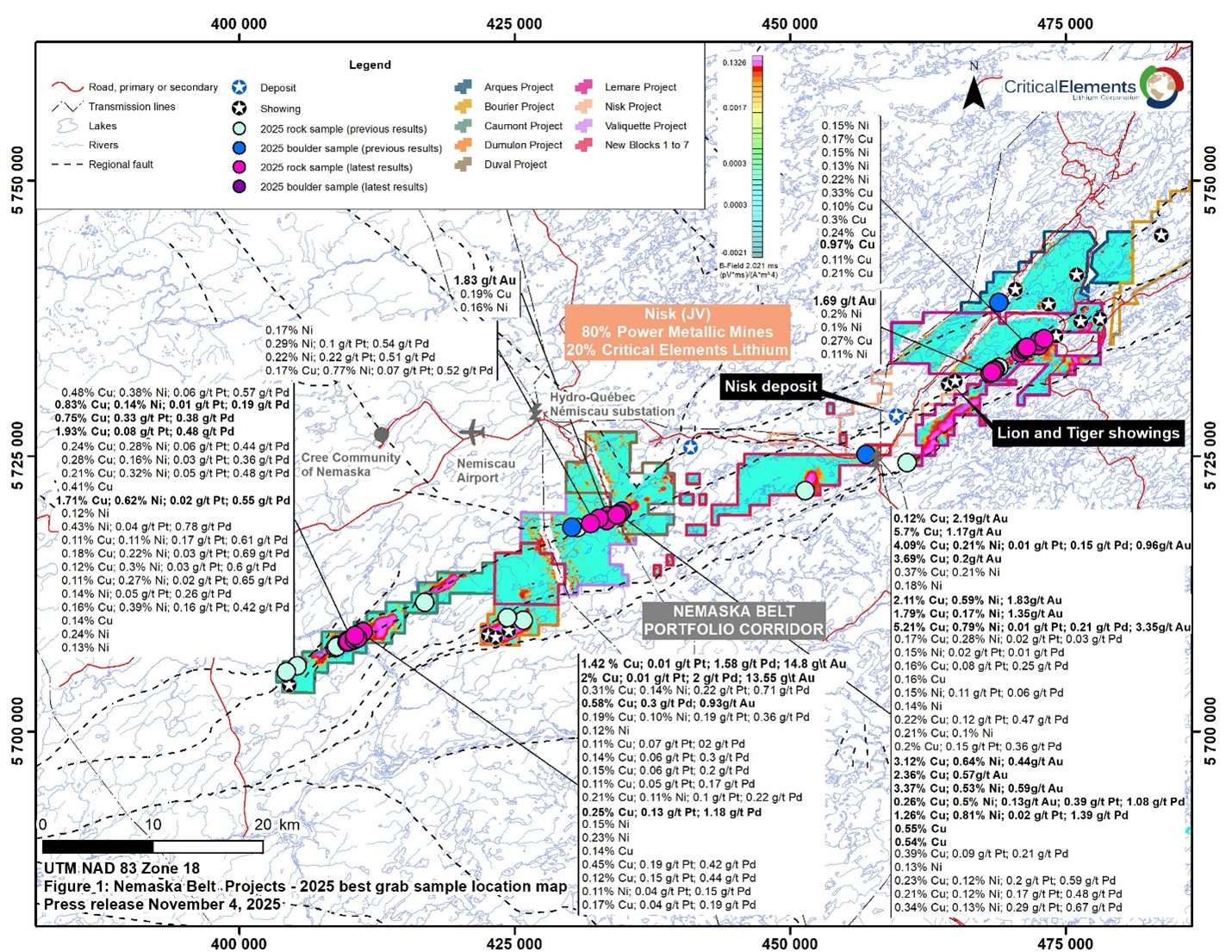 MONTREAL, QC / ACCESS Newswire / November 4, 2025 / Critical Elements Lithium Corporation (TSXV:CRE)(OTCQX:CRECF)(FSE:F12) (“Critical Elements” or the “Corporation”) is pleased to announce the latest results from the 2025 summer exploration program completed on Critical Elements’ 100%-owned Nemaska Belt properties group, in the Eeyou Istchee region of Québec (Figure 1).