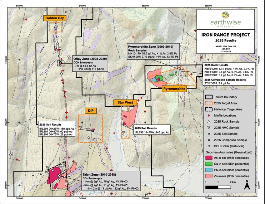 VANCOUVER, BC / ACCESS Newswire / November 17, 2025 / Earthwise Minerals Corp. (CSE:WISE)(FSE:966) (“Earthwise” or the “Company“) is pleased to announce that it has received results from 2025 fieldwork with samples grading up to 13.4 g/t Au, 27.2 g/t Ag, > 10,000 ppm As, and 2.7% Pb. Earthwise holds the exclusive option to acquire up to an 80% interest in the Iron Range Project from Eagle Plains Resources Ltd. (TSX-V:EPL)(OTCQB:EGPLF) (“EPL” or “Eagle Plains”).