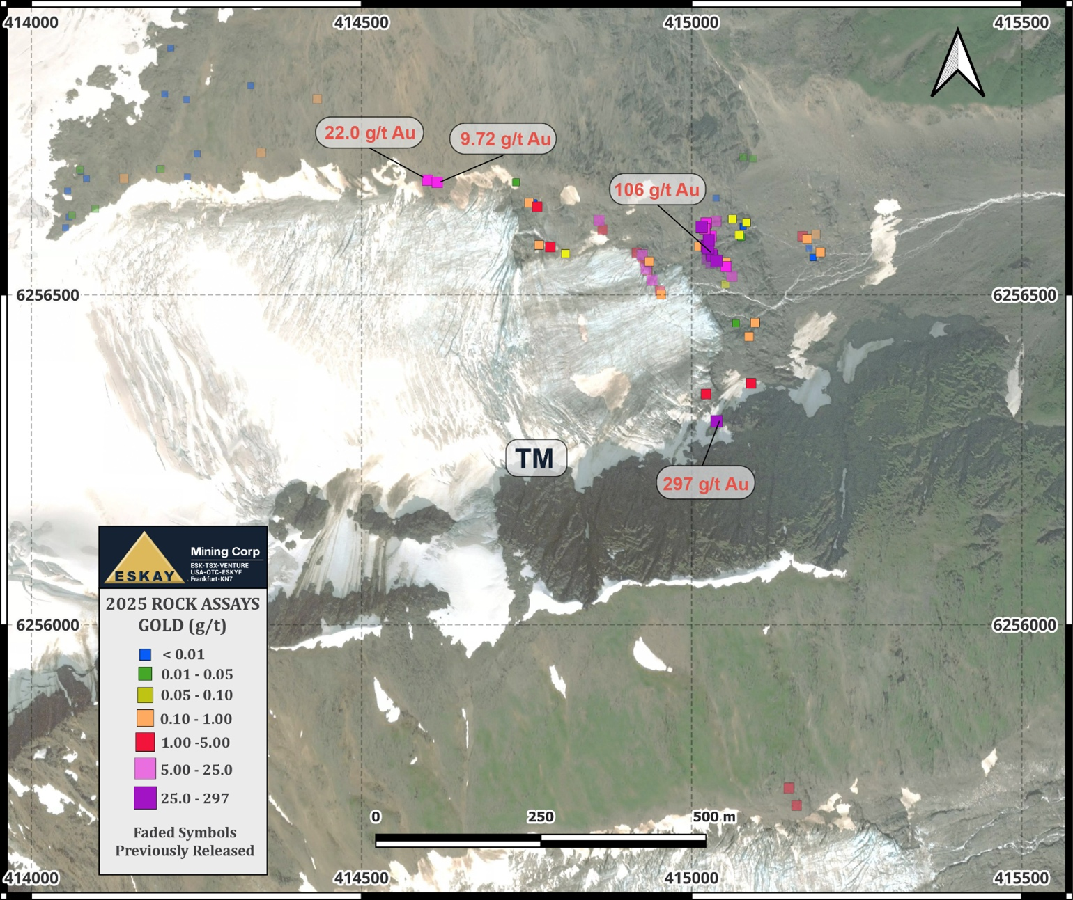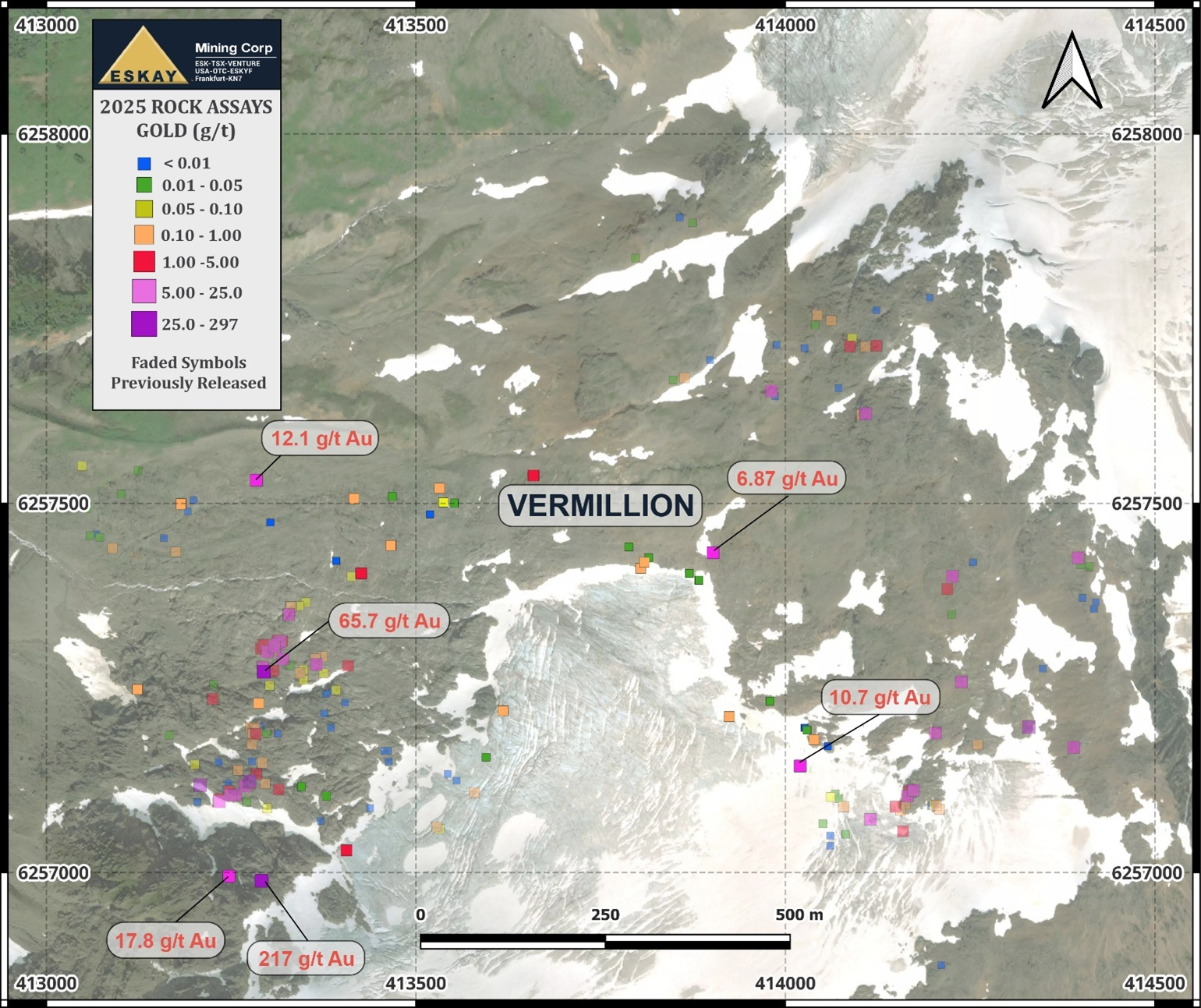 TORONTO, ON / ACCESS Newswire / November 7, 2025 / Eskay Mining Corp. (“Eskay” or the “Company”) (TSXV:ESK)(OTC PINK:ESKYF)(Frankfurt:KN7)(WKN:A0YDPM) is pleased to provide additional assay results from its prospecting and sampling program at its 100% controlled Consolidated Eskay Project (“CEP”) in the Golden Triangle, British Columbia. Over the summer months of 2025, the Company’s geological team systematically prospected and sampled the Vermillion, TM, Red Lightning, and Big Red zones surrounding Unuk Finger Mountain in the southern extent of CEP where high grade gold veins were initially discovered in 2024.