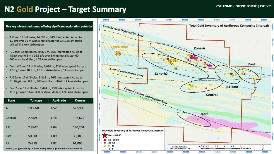 Formation Metals Inc. is a North American mineral acquisition and exploration company focused on the development of quality properties that are drill-ready with high-upside and expansion potential. Formation’s flagship asset is the N2 Gold Project, an advanced gold project with a global historic resource of ~870,000 ounces (18 Mt grading 1.4 g/t Au (~810,000 oz Au) across four zones (A, East, RJ-East, and Central)2,3 and 243 Kt grading 7.82 g/t Au (~61,000 oz Au) across the RJ zone2,4) and six mineralized zones, each open for expansion along strike and at depth including the “A” zone, of which only ~35% of strike has been drilled (>3.1 km open), and the “RJ” zone, host to historical high-grade intercepts as high as 51 g/t Au over 0.8 metres.