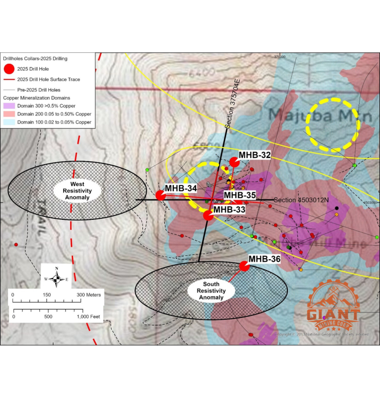 As previously indicated in the July 15, 2025, news release, Giant Mining intersected thick intervals of near-surface oxide copper mineralization at Majuba Hill, significantly expanding the Mineralized Breccia Zone. Results from holes MHB-33, MHB-34, and MHB-35 confirmed strong copper grades and continuity within breccia-hosted zones. These findings reinforced the project’s potential as a strategic domestic copper supply source and laid the groundwork for the current breccia study, which aims to refine drill targets and accelerate advancement into Phase 2 of exploration.