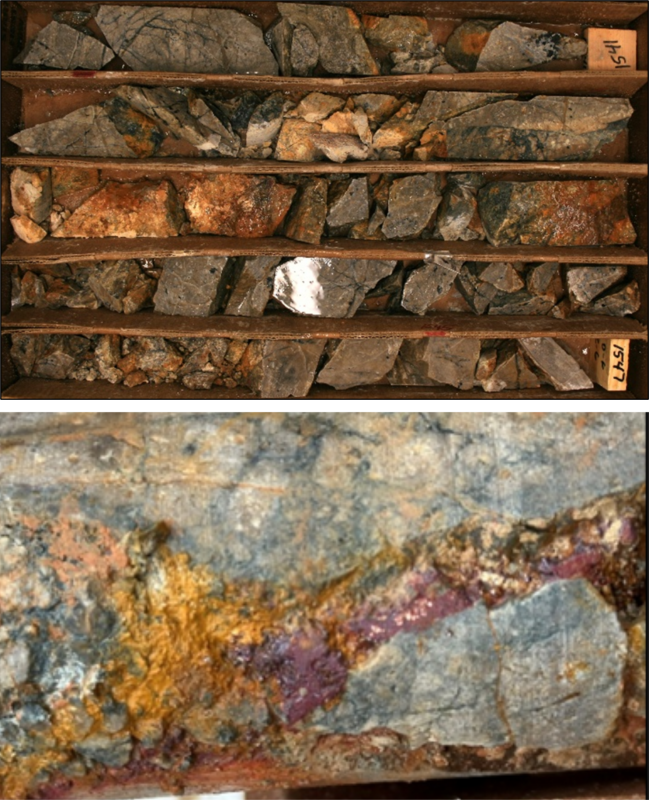 Figure 1: MHB-34 Mineralized Breccia: Chalcopyrite, Cuprite and Native Copper in Breccia. 1540-1545 feet/0.62% Cu.
