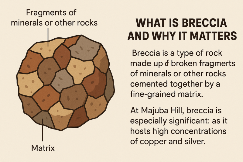 Breccia is a type of rock composed of broken mineral fragments cemented by a fine-grained matrix—essentially nature’s version of concrete—formed by intense geological processes such as faulting or hydrothermal activity. At Majuba Hill, these breccia zones host high concentrations of copper and silver, making them critical for identifying and prioritizing high-potential drill targets.