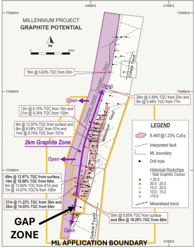 Previous RC drilling of this Gap Zone in 2013 and 2014 demonstrated strong mineralisation continuity on the Millennium Trend, including downhole results of 23m @ 0.48% Cu, 0.16% Co and 0.16g/t Au from 16m (Q-001) and 13m @ 0.53% Cu, 0.30% Co and 0.24g/t Au from 40m (Q-014). The additional lease also encompasses further area to the west to cover potential extensions of graphite mineralisation, and to the east for operational infrastructure.