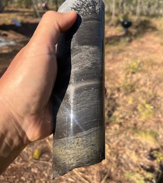 Figure 1 – Sedimentary exhalative style sulphide mineralisation within a carbonaceous mudstone: 191.5m hole WGD25001B