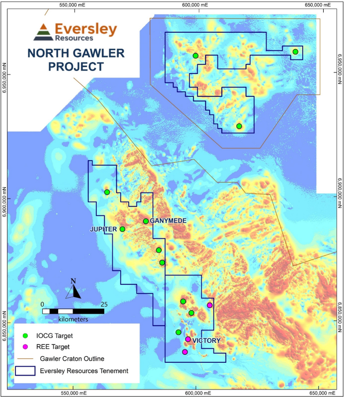 Figure 2. Eversley’s North Gawler Project exploration targets with reduced-to-pole (RTP) magnetics image.
