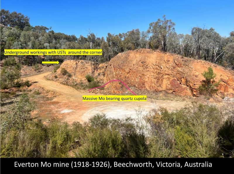 Accessory minerals included finely-disseminated pyrite, and copper in the form of azurite and malachite from a “pegmatite” dyke reportedly present north of the historic mine. Recent detailed geological mapping of the old workings identified previously unrecognized cupola textures, Unidirectional Solidification Textures (USTs), indicating mineralization is hosted in the uppermost part of an undrilled porphyry molybdenum +/- copper system (Figure 2). USTs are a key indicator in idenitfying pencil porphyry mineralization (Figure 3).