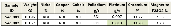 The presence of sulfide rich rocks outside the previous zone of interest prompted the team to extend sampling and collect stream sediment samples approximately 3.5 km further east to investigate the potential for prospection of that area. One of the stream sediment samples may indicate a potential upstream anomaly as it detected trace platinum values of 0.013 g/t Platinum, while palladium was below detection limits These results could point out to a distal PGE dispersion plume.