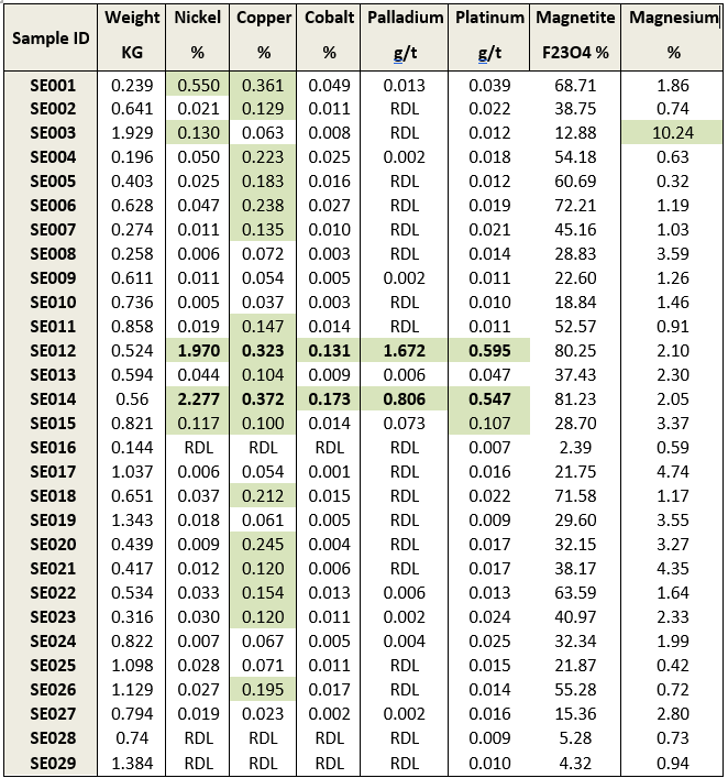 Table 1. Results from chosen surface grab samples RDL: Reported Detection Limit